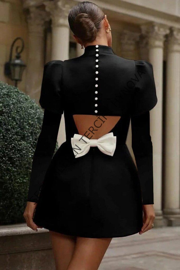 Kadın Uzun Kollu Yarı Balıkçı Yaka Arkadan Kurdela Detaylı Mini Atlas Elbise