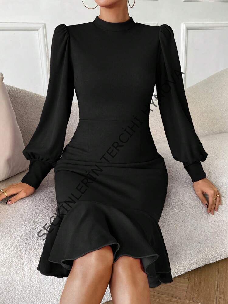 Kadın Uzun Kollu Yarı Balıkçı Yaka Etek Ucu Fırfır Detaylı Midi Ithal Krep Elbise