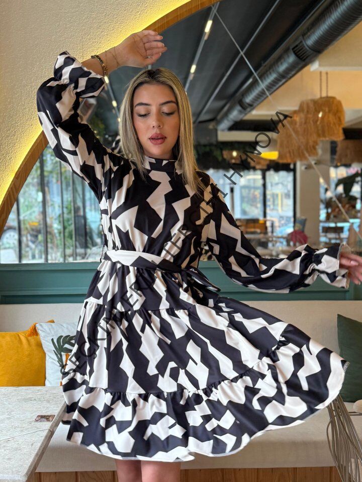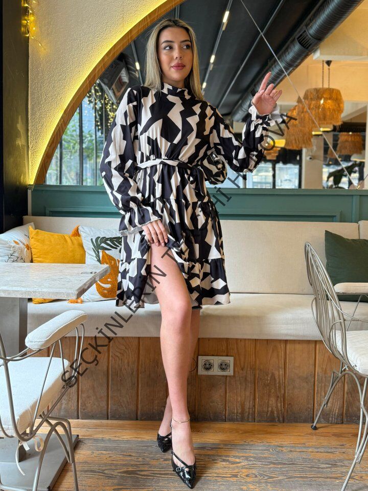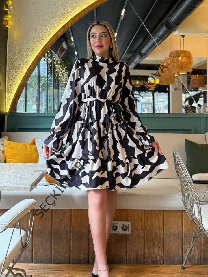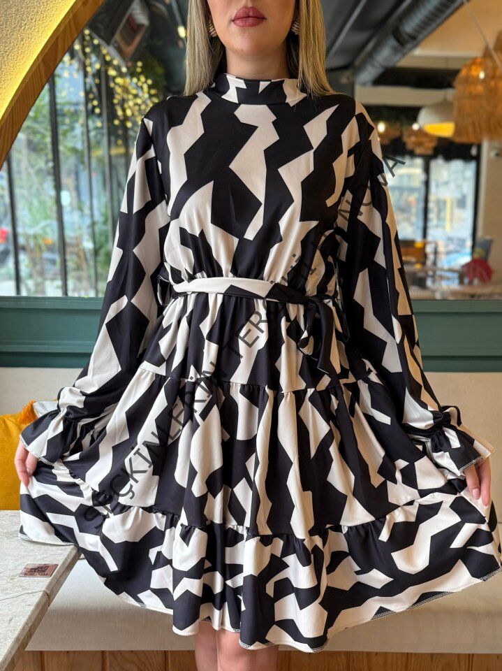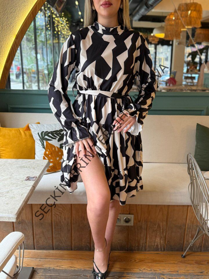 Kadın Uzun Kollu Yarı Balıkçı Yaka Geometrik Desen Kısa şardonlu Dalgıç Elbise