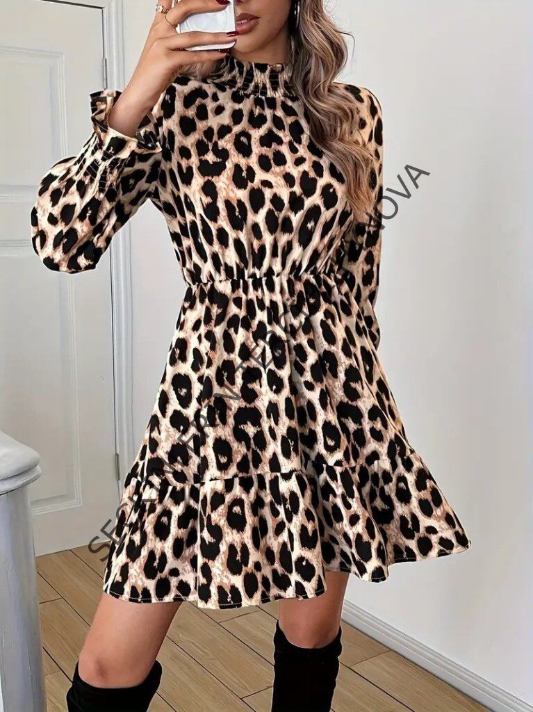 Kadın Uzun Kollu Yarı Balıkçı Yaka Leopar Desenli Modal Mini Elbise