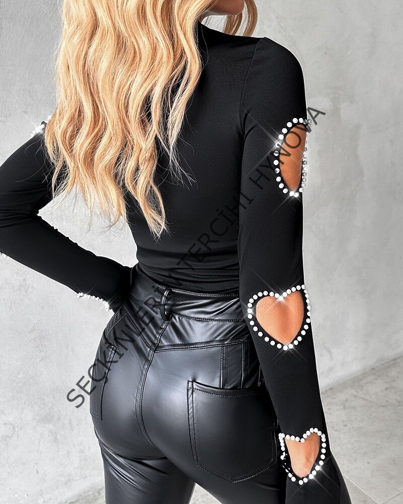 Kadın Uzun Kollu Yarı Balıkçı Yaka Pencere Detaylı Kolları Kalp Desen Taşlı Viskon Bluz