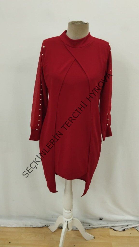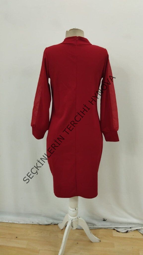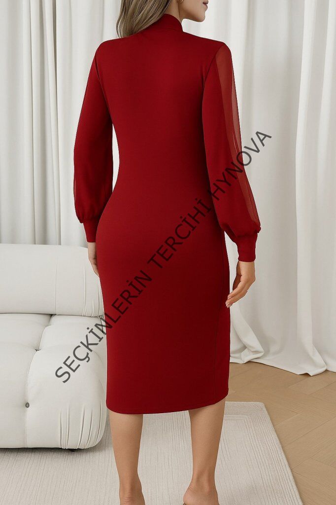 Kadın Uzun Kollu Yarı Balıkçı Yaka Tül Ve Inci Detaylı Kısa Ithal Krep Midi Elbise