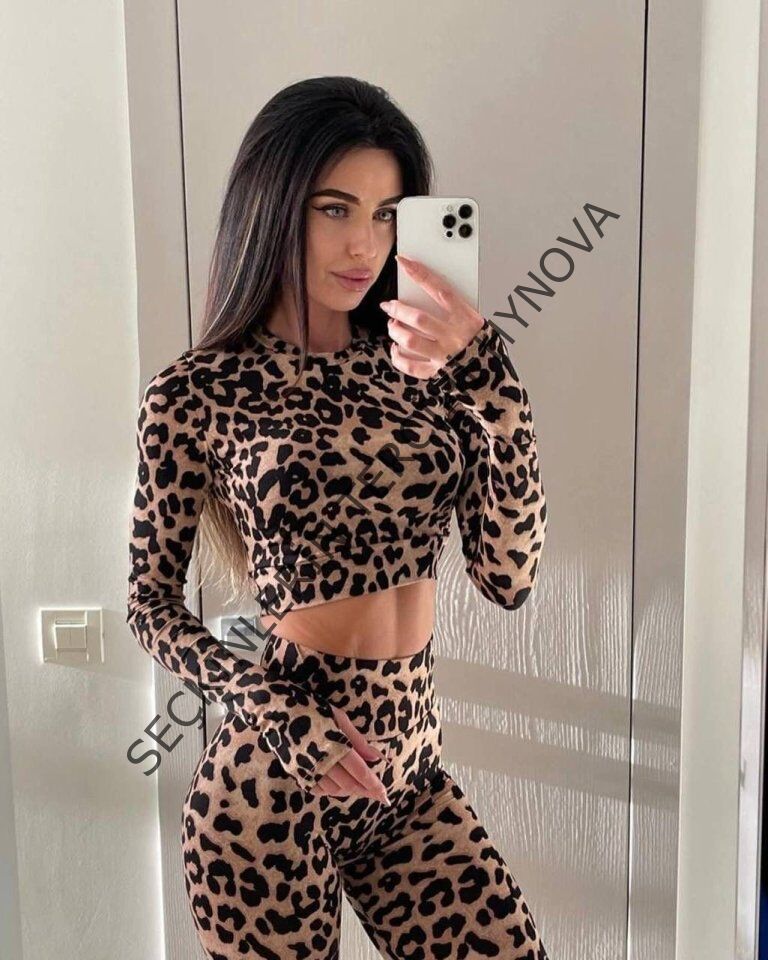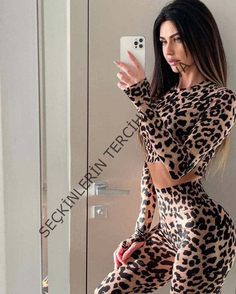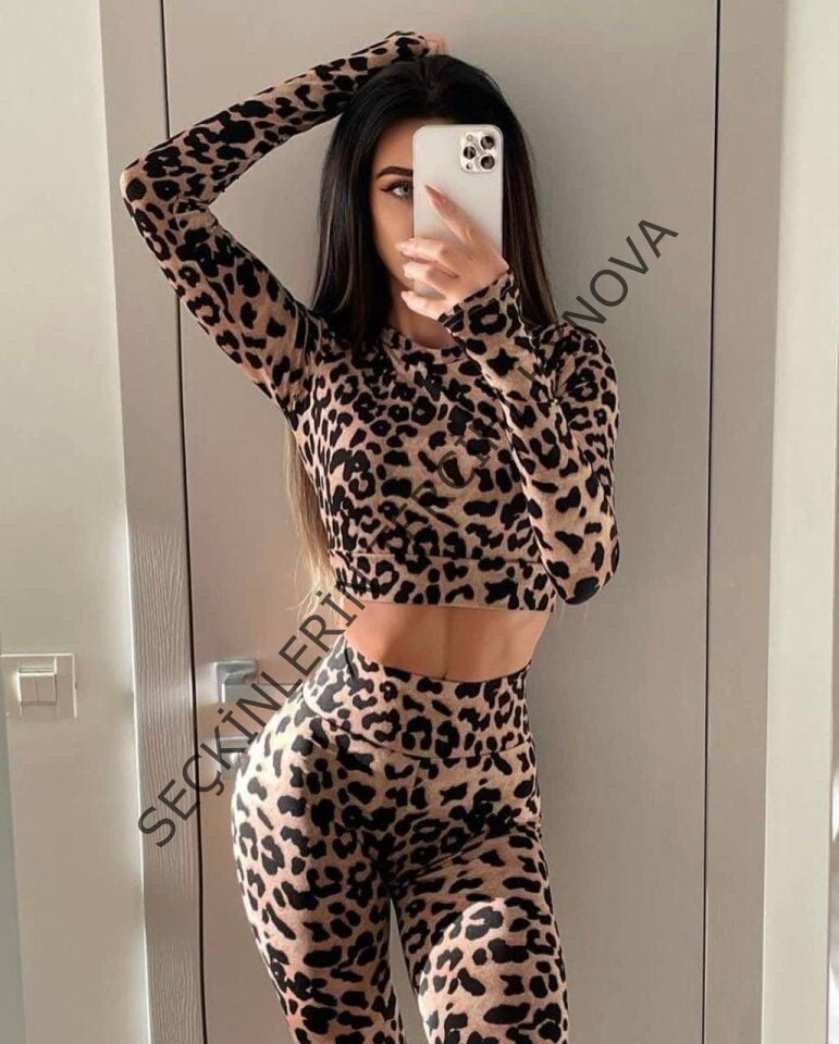 Kadın Uzun Kollu Yarım Balıkçı Yaka Full Leopar Baskılı Kısa Bluz Ve Pantolon Ikili Takım
