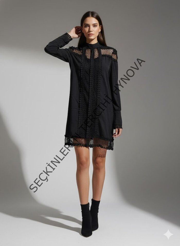 Kadın Uzun Kollu Yarım Balıkçı Yaka Transparan Detaylı Mini Elbise