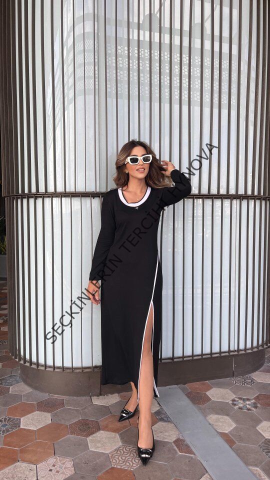 Kadın Uzun Kollu Yuvarlak Ribana Yaka Yırtmaçlı Uzun Viskon Iki Iplik Elbise