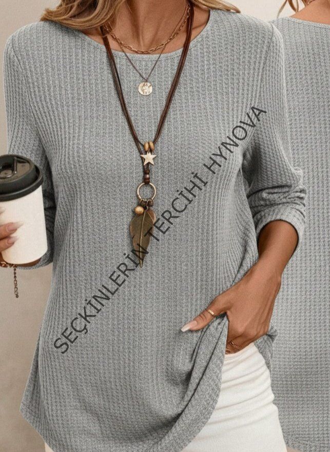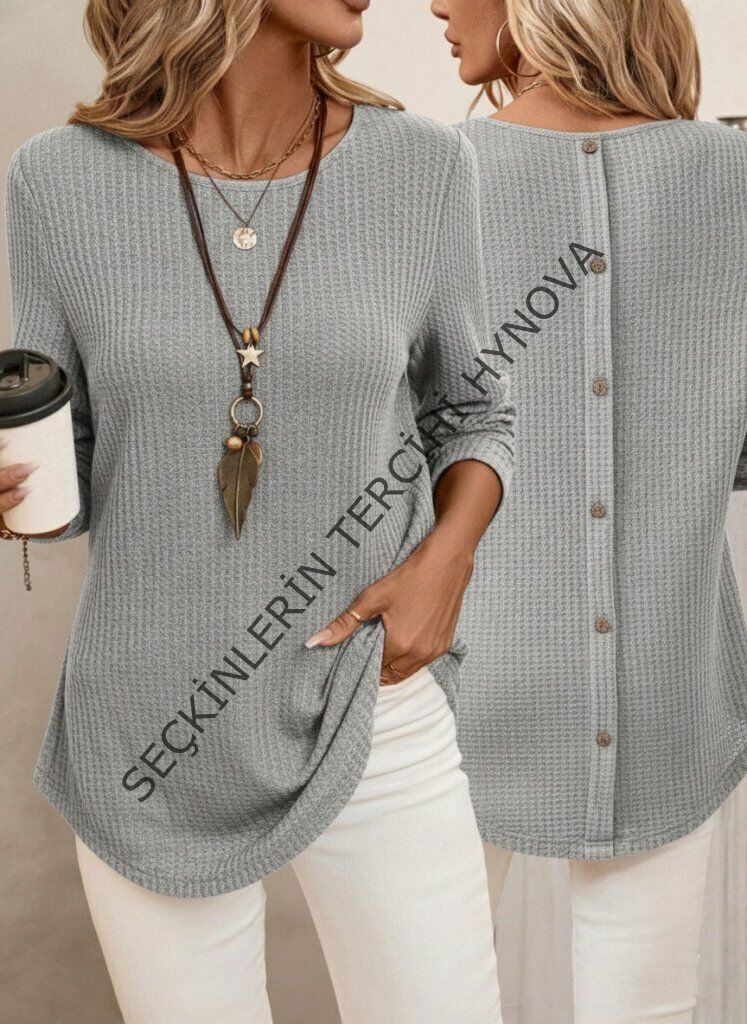 Kadın Uzun Kollu Yuvarlak Yaka Arkadan Düğmeli Waffle Bluz