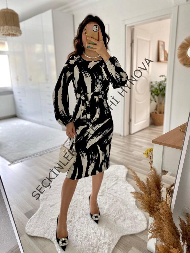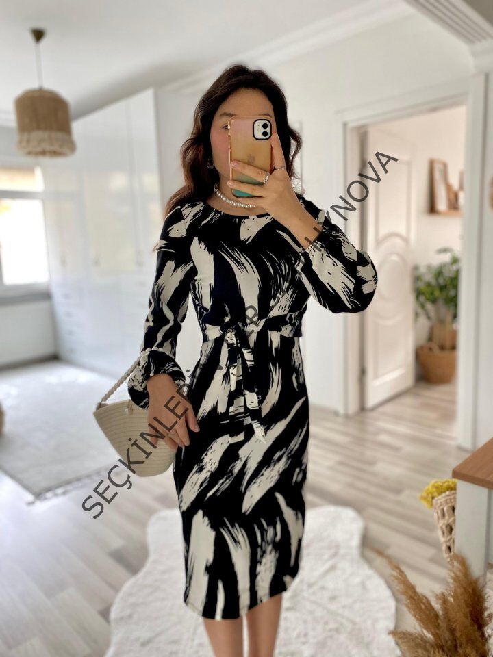 Kadın Uzun Kollu Yuvarlak Yaka Belden Kuşaklı Hazır Desenli Midi Krep Elbise