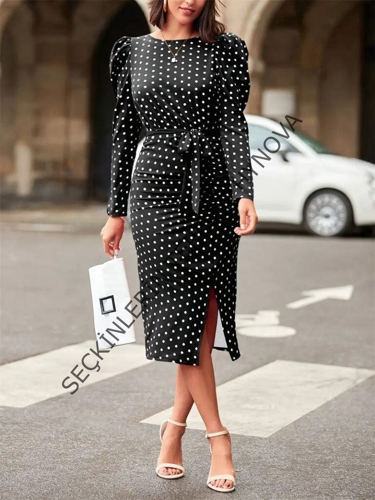 Kadın Uzun Kollu Yuvarlak Yaka Belden Kuşaklı önden Yırtmaçlı örme Krep Elbise