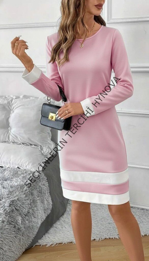 Kadın Uzun Kollu Yuvarlak Yaka Etek Ucu şerit Detaylı Mini Dalgıç Elbise