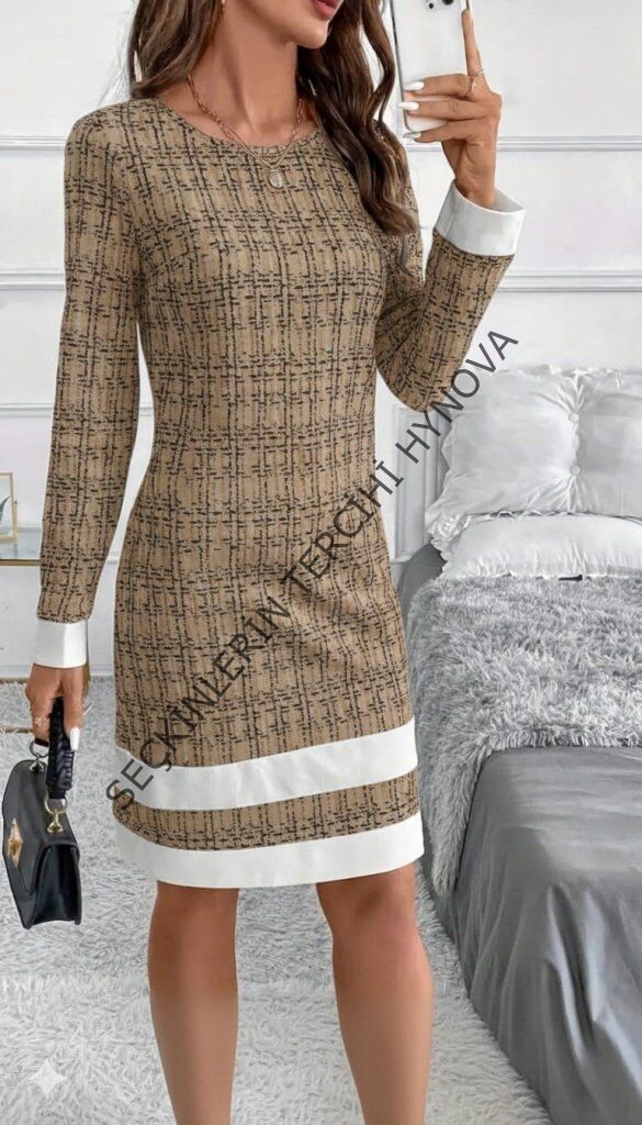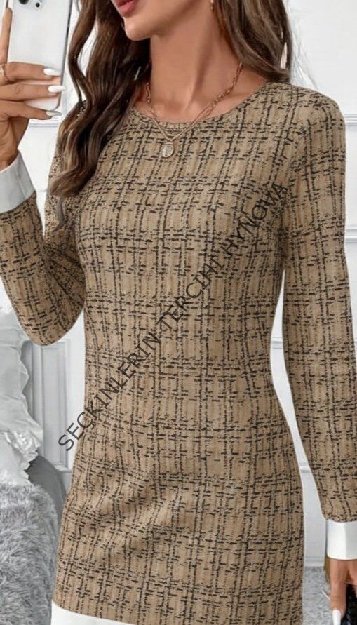 Kadın Uzun Kollu Yuvarlak Yaka Etek Ucu şerit Detaylı Mini Dokuma Elbise