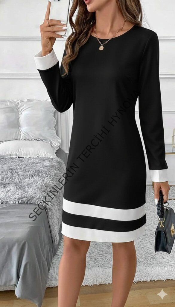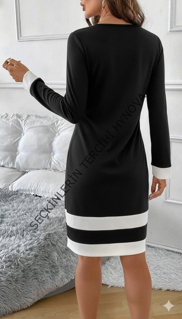 Kadın Uzun Kollu Yuvarlak Yaka Etek Ucu şerit Detaylı Mini Siyah Beyaz Dalgıç Elbise