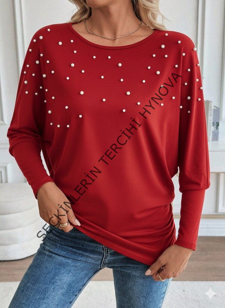 Kadın Uzun Kollu Yuvarlak Yaka Incili Viskon Bluz
