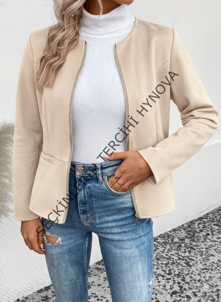 Kadın Uzun Kollu Yuvarlak Yaka önden Fermuarlı Süet Ceket