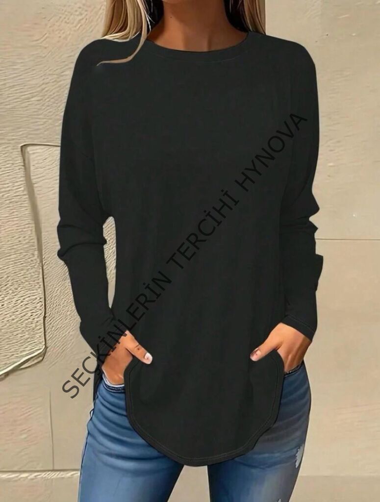 Kadın Uzun Kollu Yuvarlak Yaka Salaş Iki Iplik Bluz