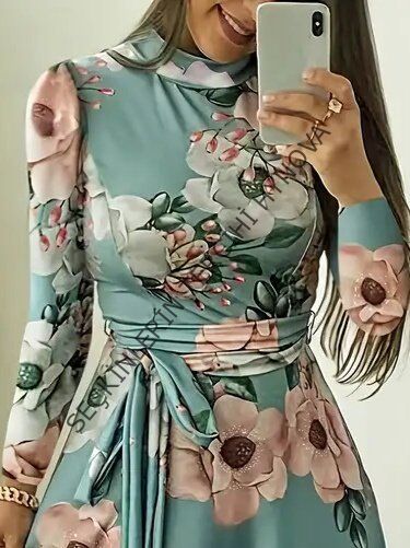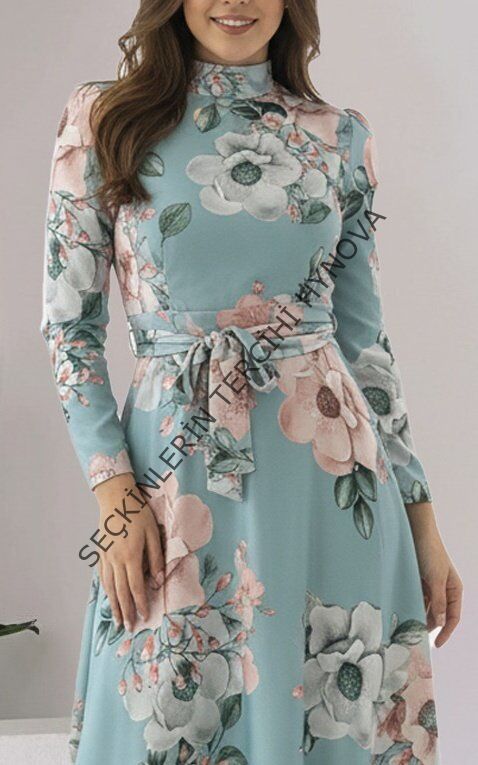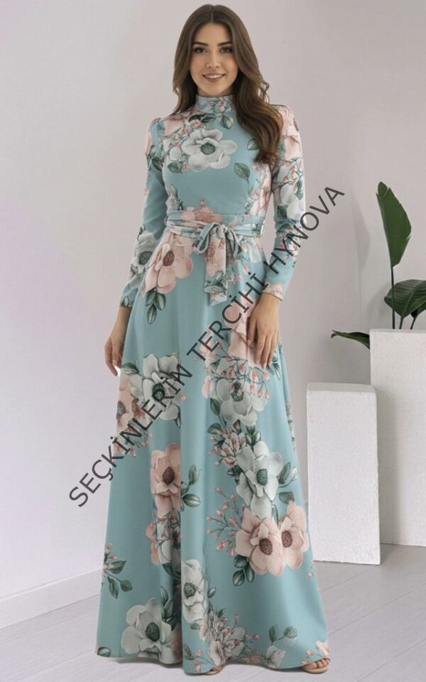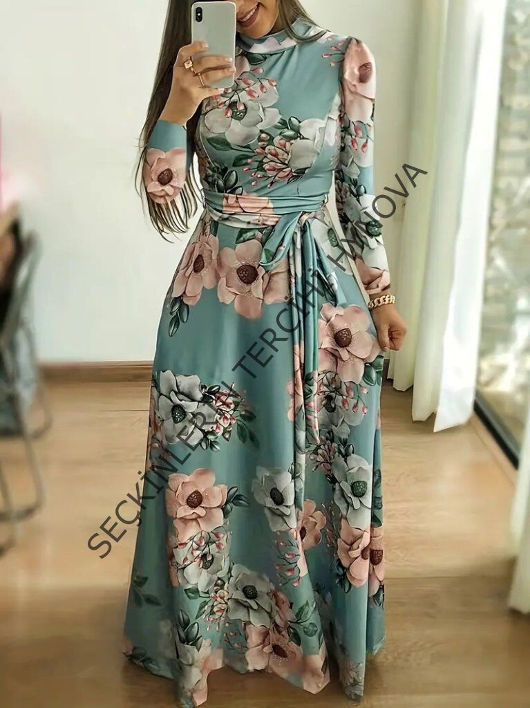 Kadın Uzun Kollu Yuvarlak Yakalı Beli Kuşaklı Desenli Süprem Uzun Elbise