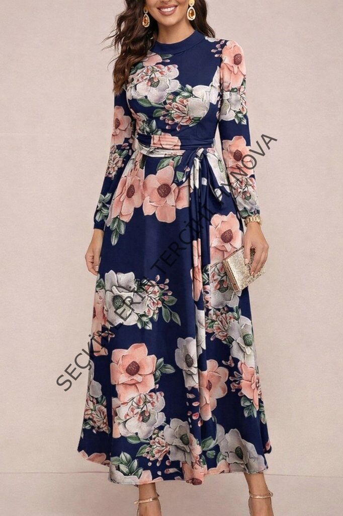 Kadın Uzun Kollu Yuvarlak Yakalı Beli Kuşaklı Desenli Süprem Uzun Elbise