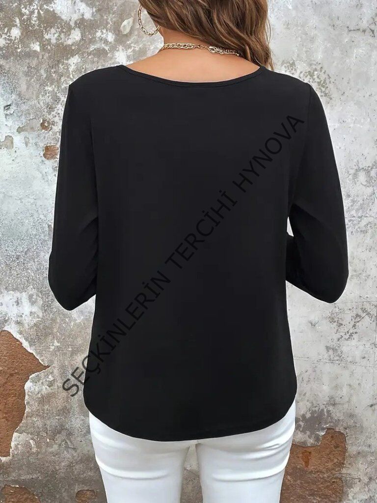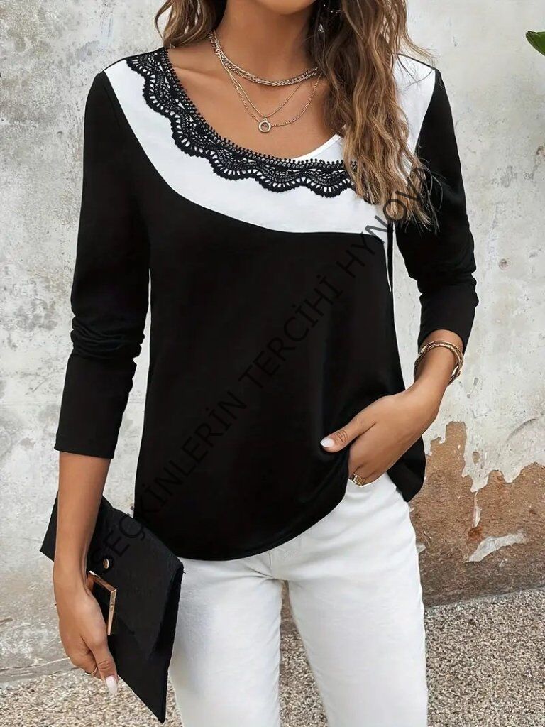 Kadın Uzun Kollu Yuvarlak Yakalı çift Renkli Dantel Detaylı Viskon Bluz
