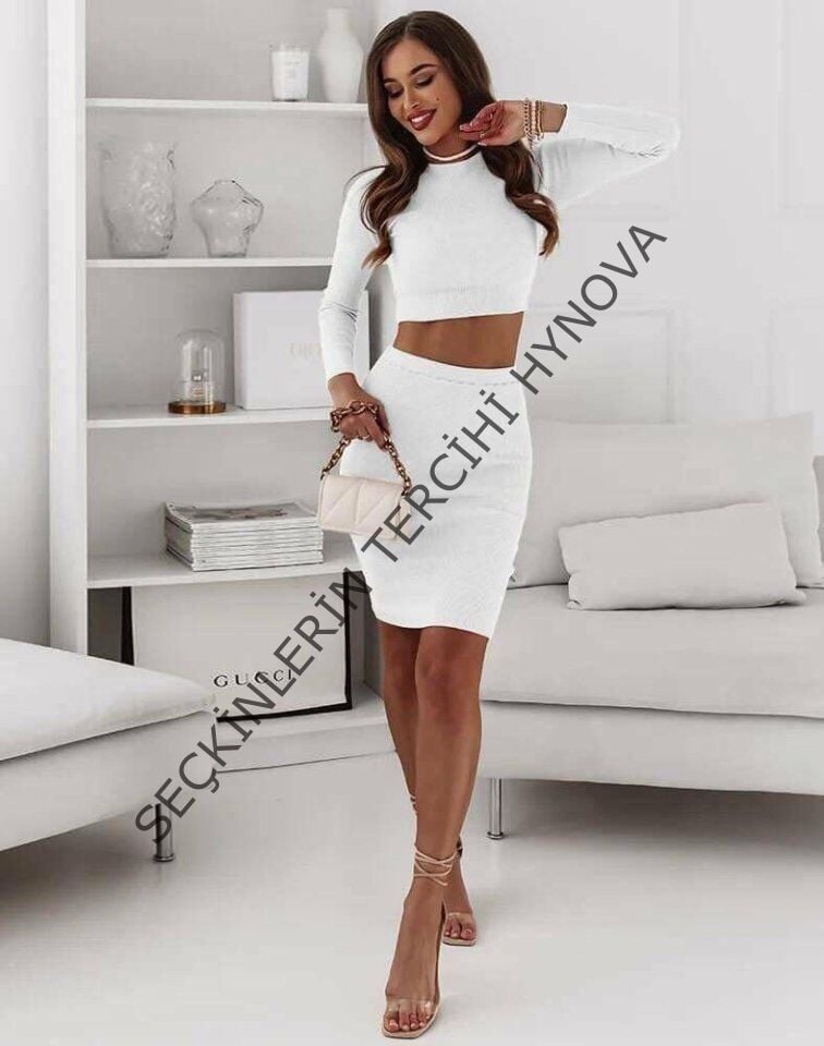 Kadın Uzun Kollubisiklet Yaka Kısa Crop Ve Yüksek Bel Mini Etek Kaşkorse Kumaş Ikili Takım