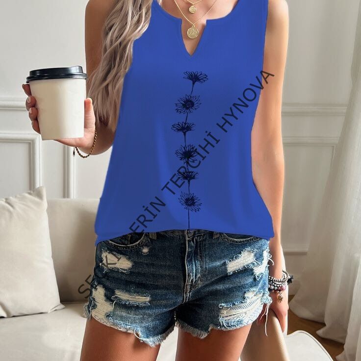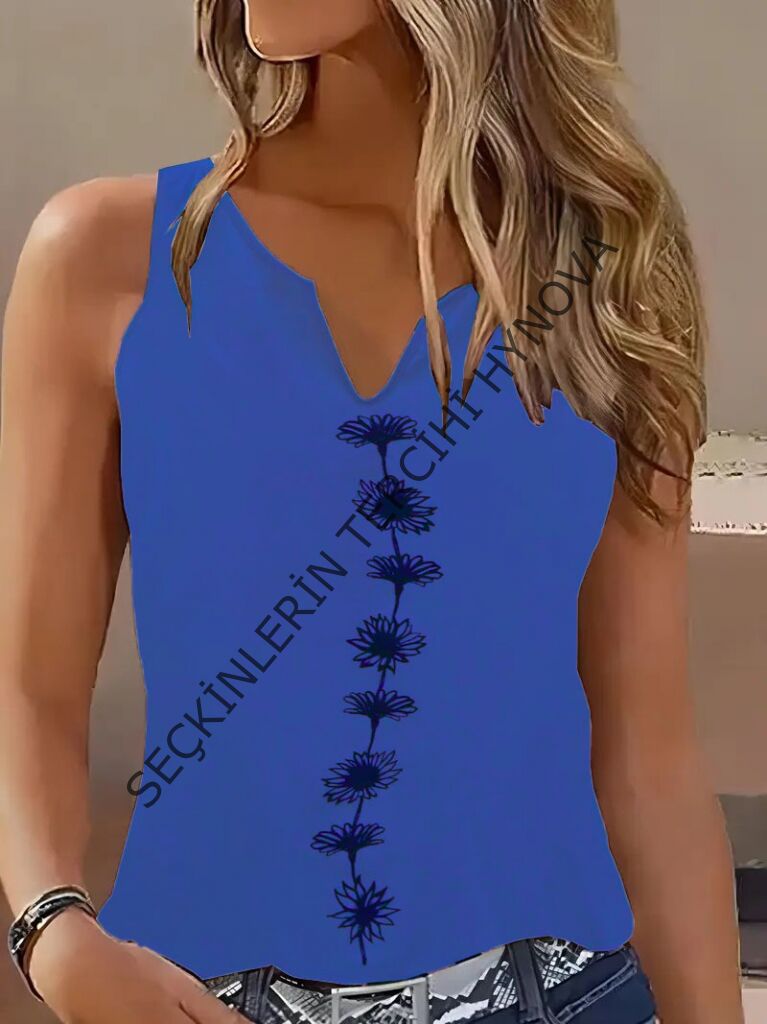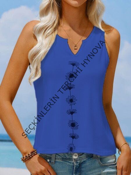 Kadın V Yaka Su Yolu çiçek Baskı Kolsuz Viskon Bluz