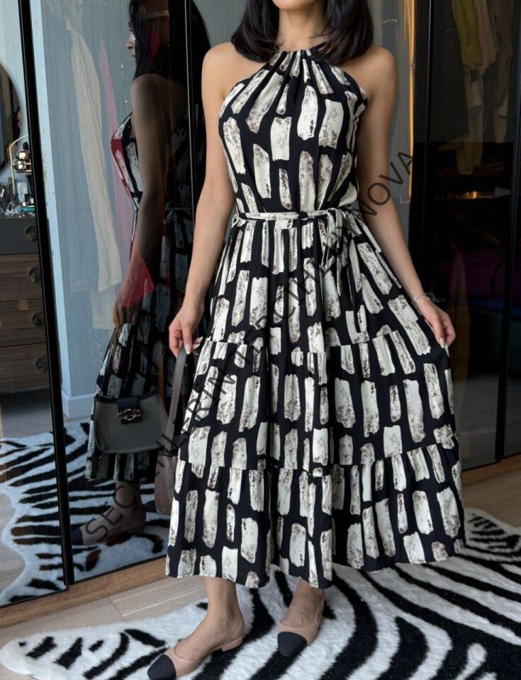 Kadın Viskon Kumaş Ip Askılı Halter Yaka Cepli Midi Boy Elbise