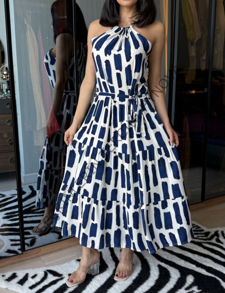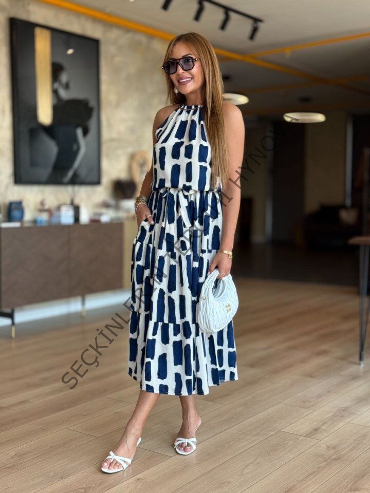 Kadın Viskon Kumaş Ip Askılı Halter Yaka Cepli Midi Boy Elbise