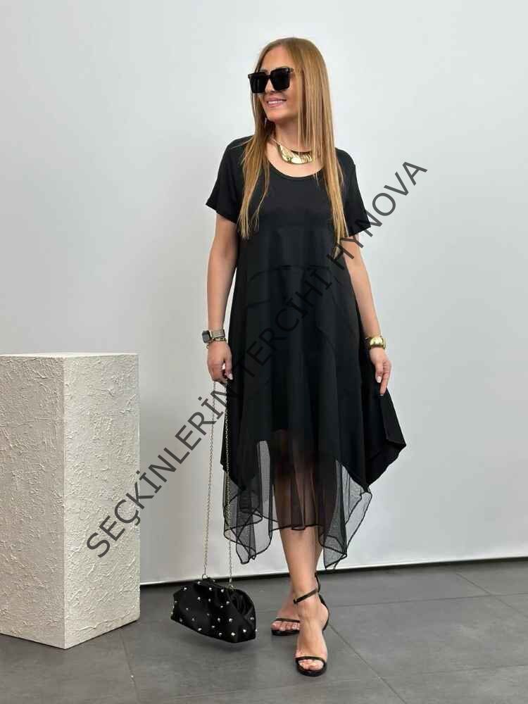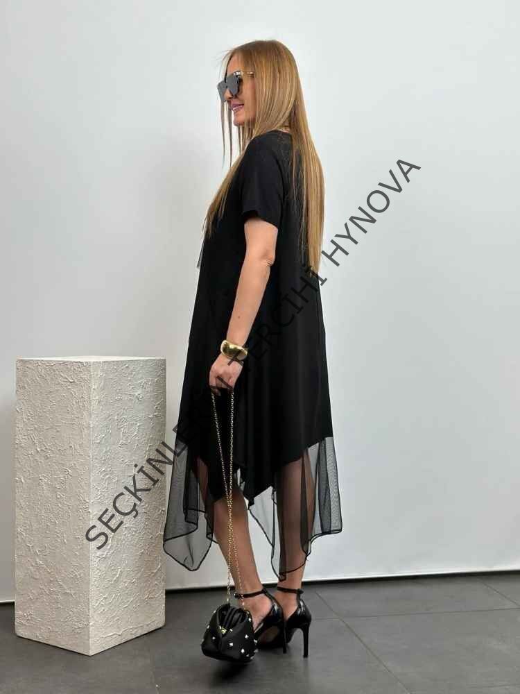 Kadın Viskon Kumaş Tül Detaylı Asimetrik Elbise