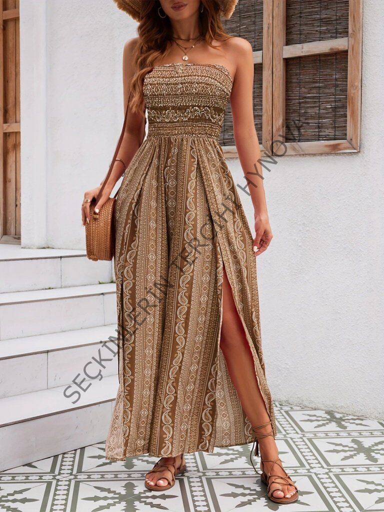 Kadın Yakası Gipe Detaylı önden Yırtmaç Detaylı Desenli Süprem Pantolun Etek Tulum