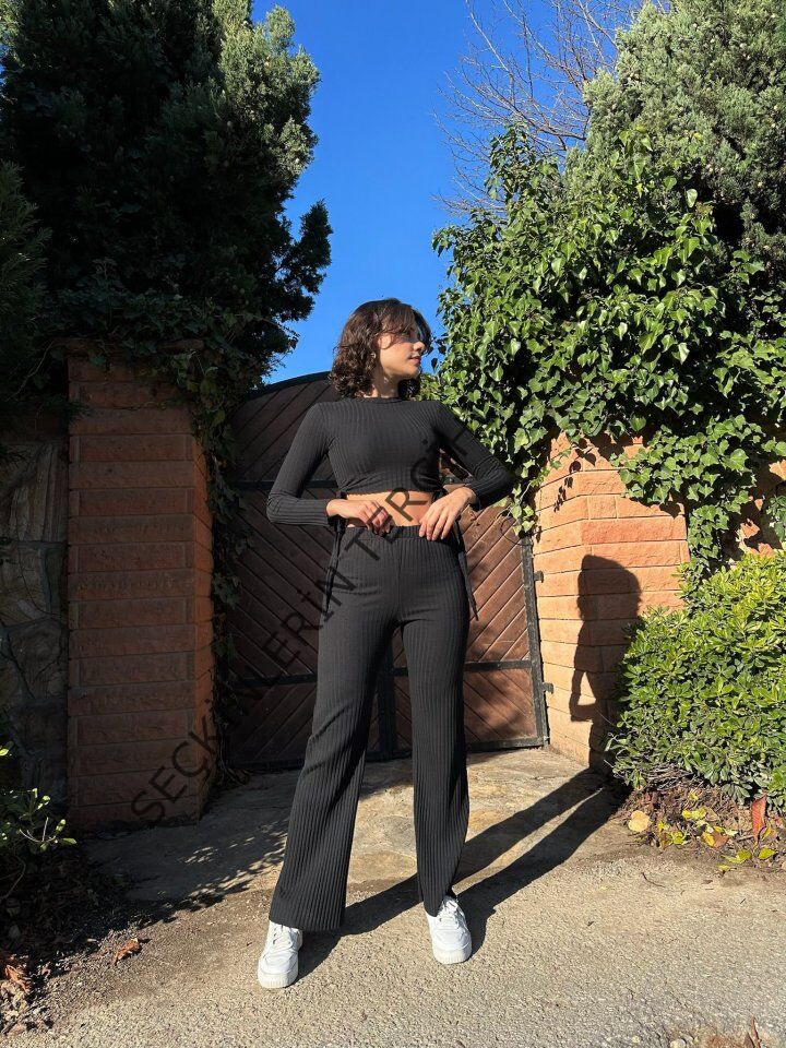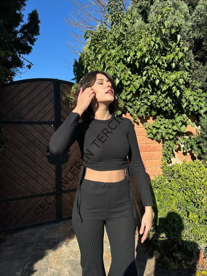 Kadın Yandan Bağlamalı Geniş Paçalı Fitil Kaşkorse İkili Takım