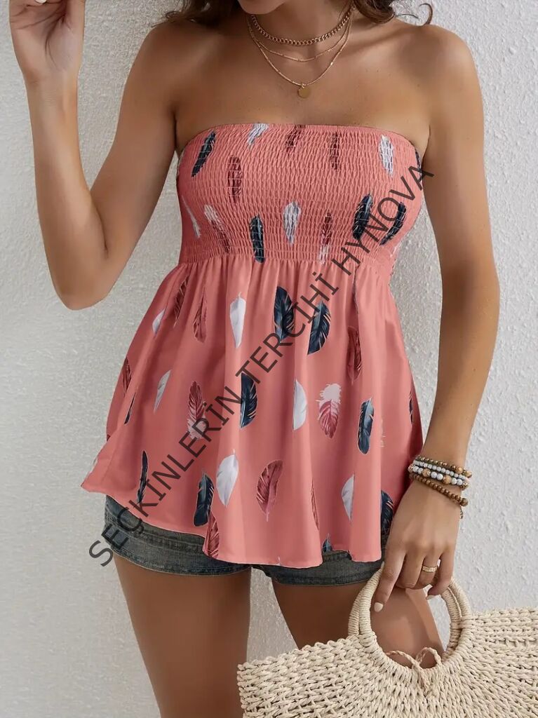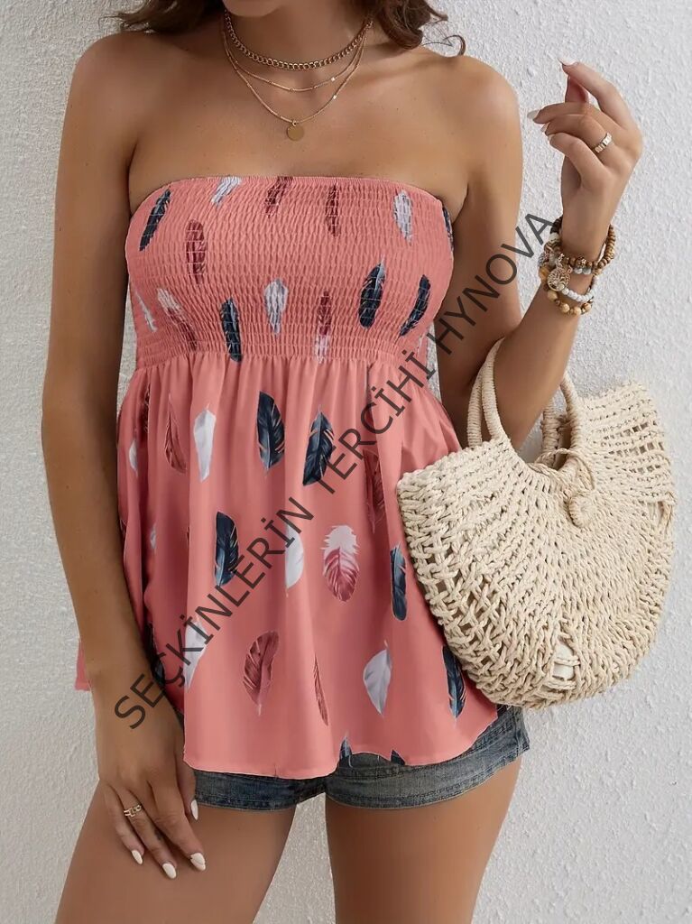 Kadın Yaprak Desenli Göğsü Gipeli Mosskrep Straplez Bluz