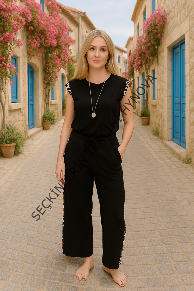 Kadın Yarasa Kol Dijital Baskı Detay Bluz Ve Yanı şerit Detay Kristal Kumaş Pantolon Ikili Takım