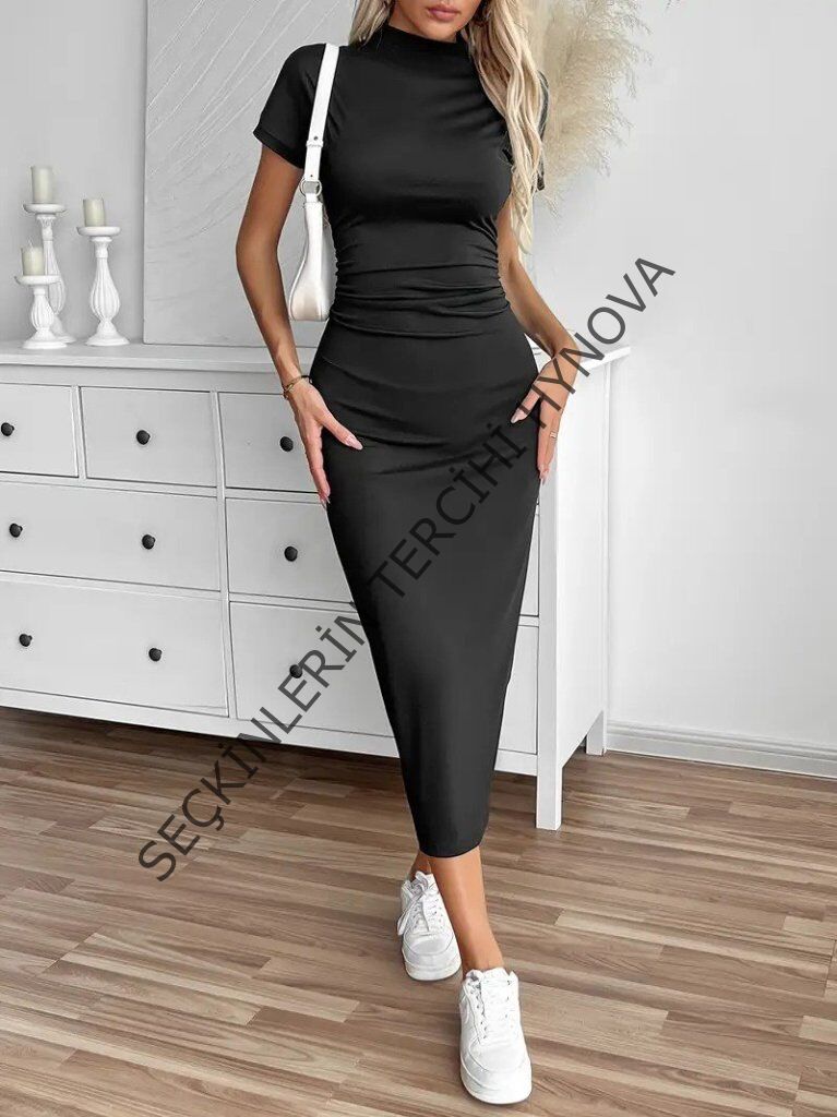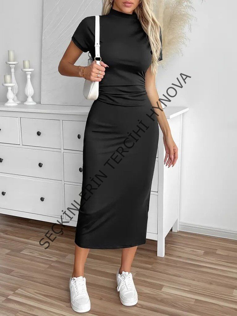 Kadın Yarı Balıkçı Yaka Yırtmaçlı Dalgıç Midi Elbise