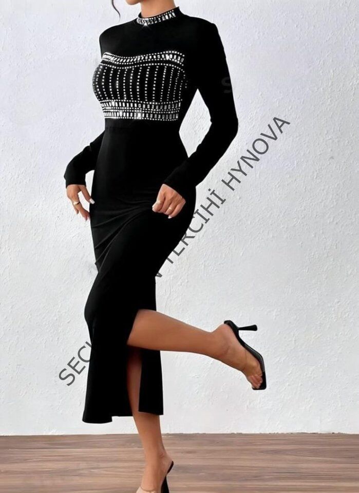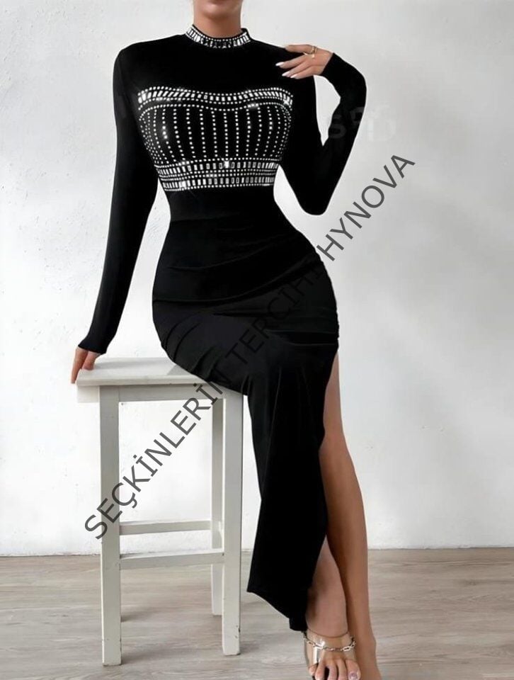 Kadın Yarım Balıkçı Yaka Taş Işemeli Bacak Dekolteli Maxi Boy Elbise