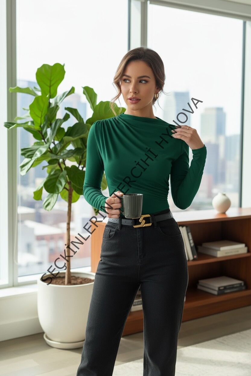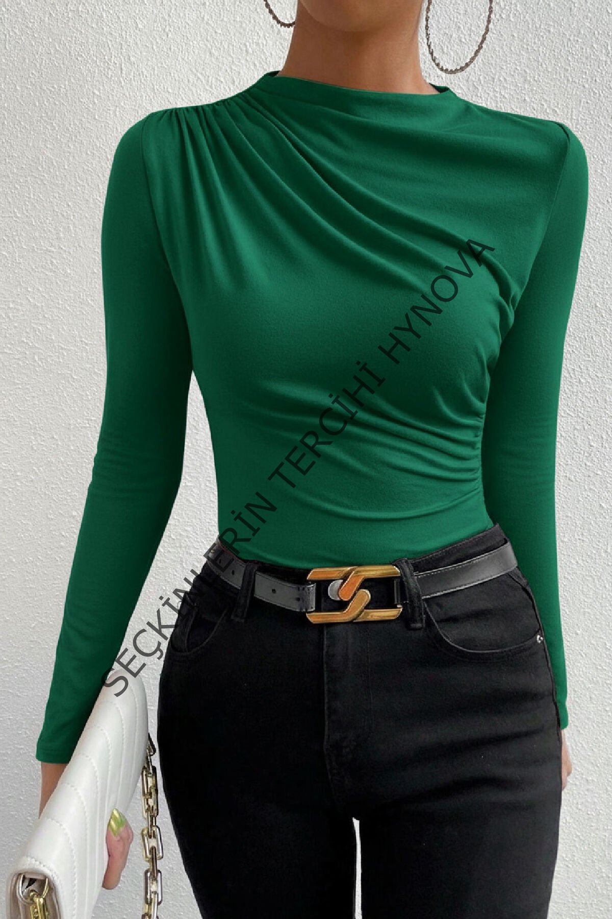 Kadın Yeşil Belden ve Boyundan Büzgü Detaylı Uzun Kollu Bluz