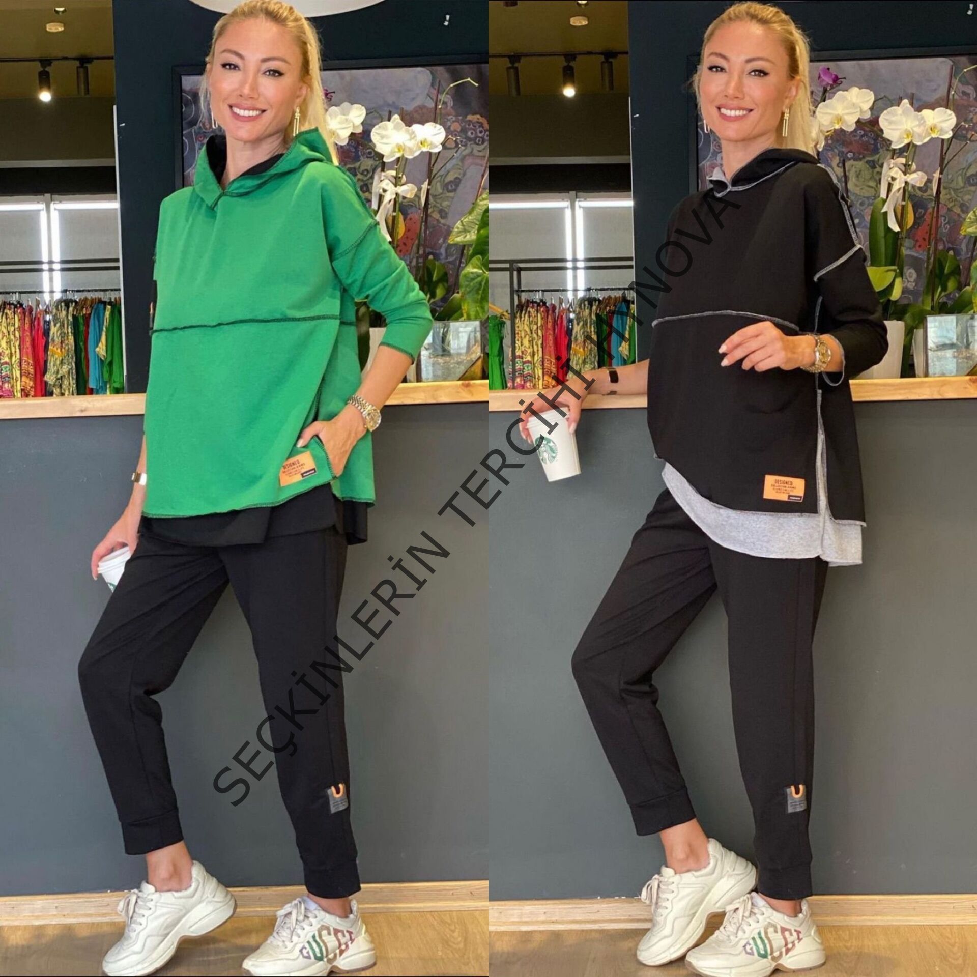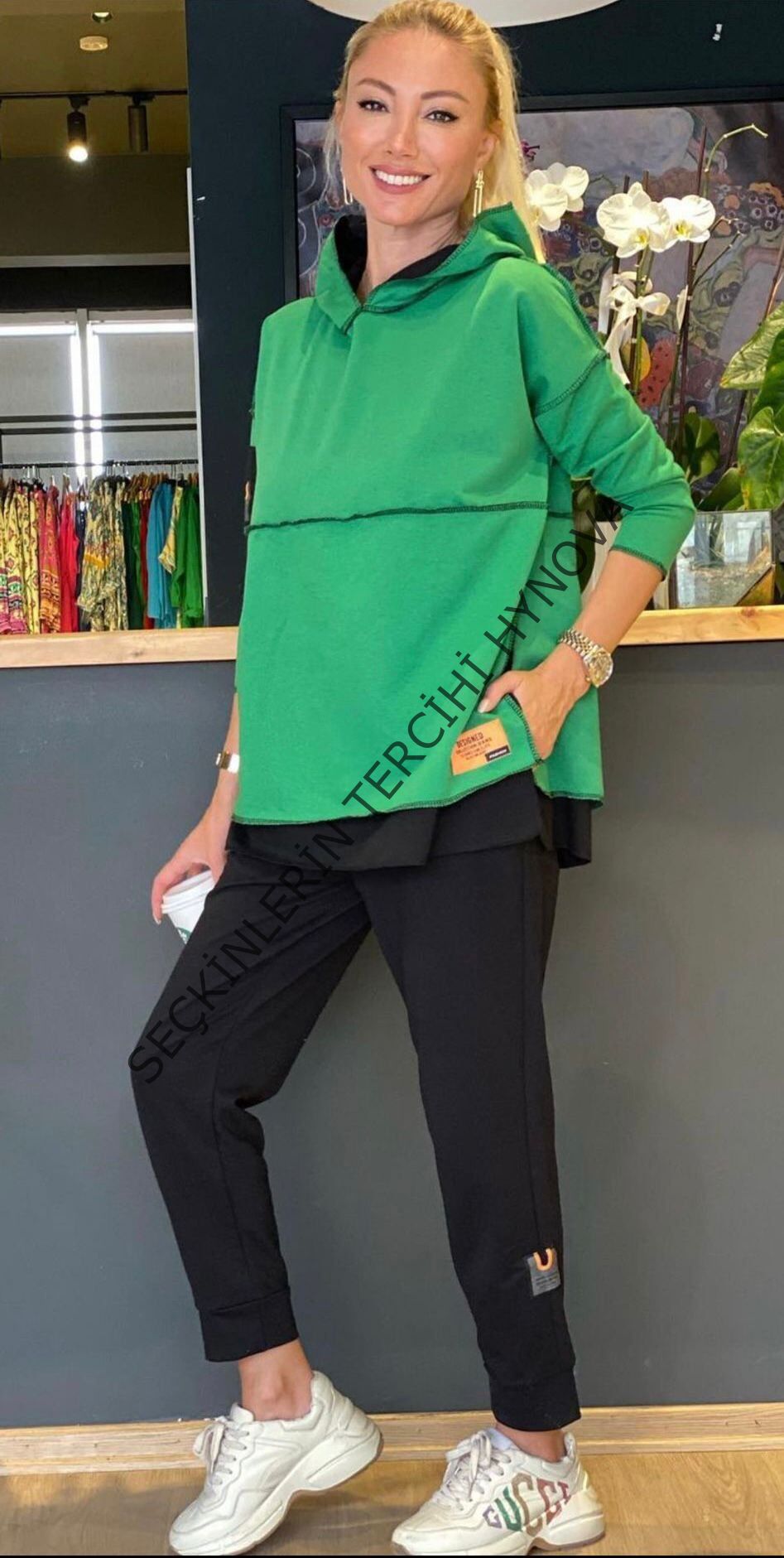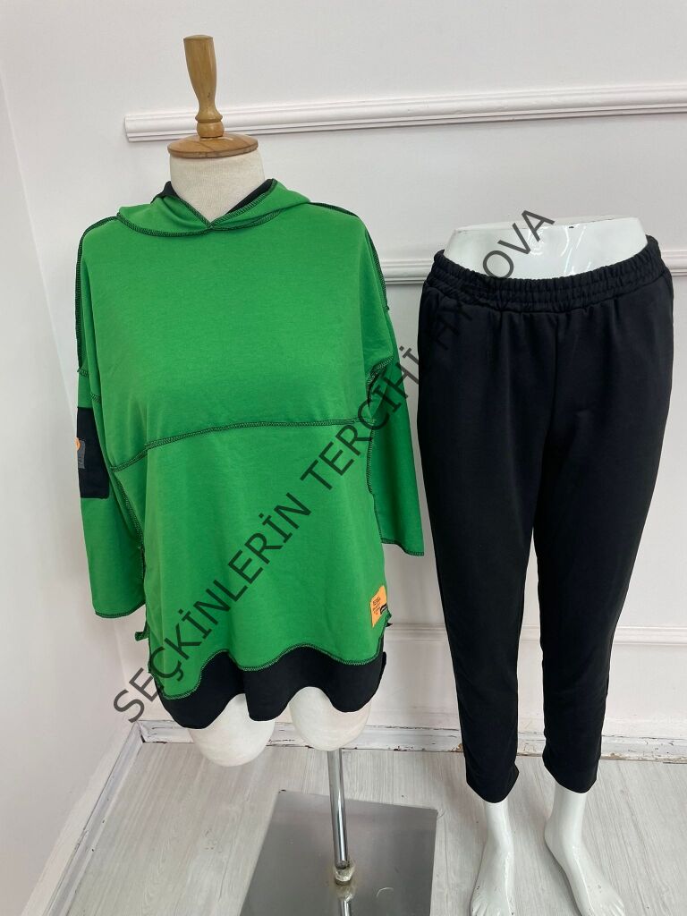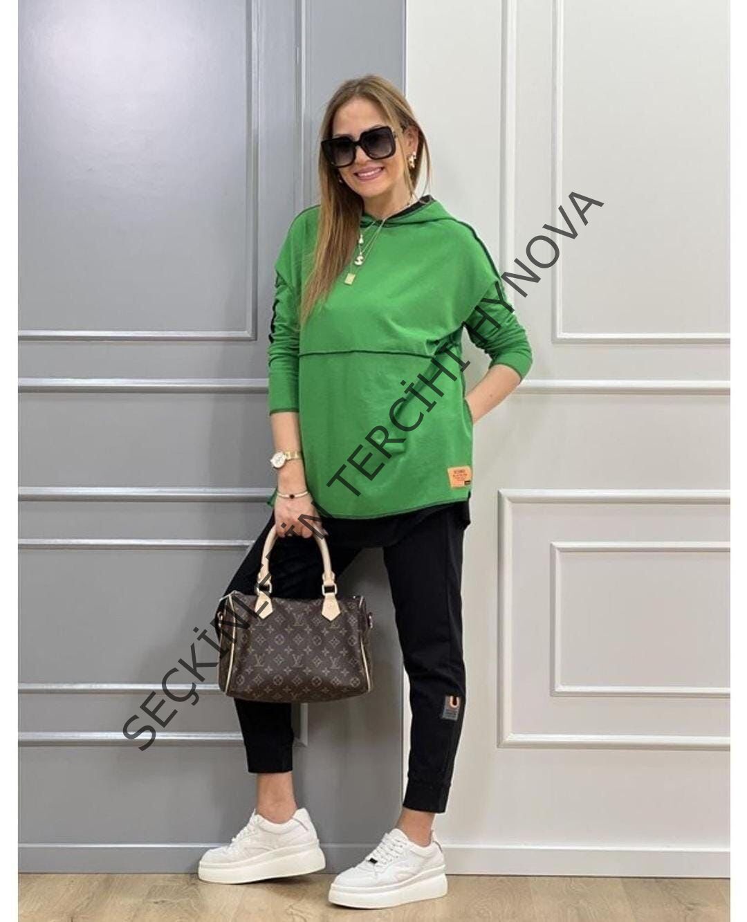Kadın Yeşil Kapşonlu Etek Ucu Detay Arma Ters Dikiş Gorunumlu Ikili Takım