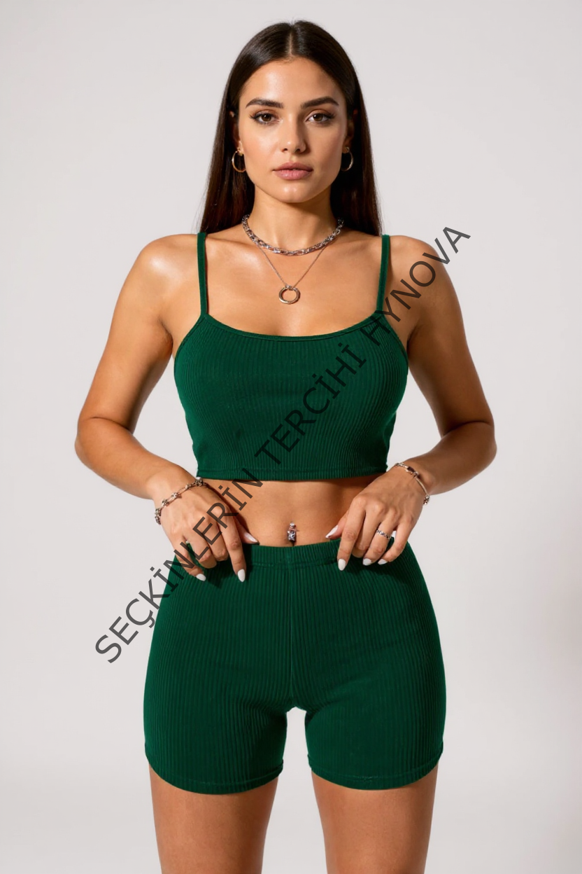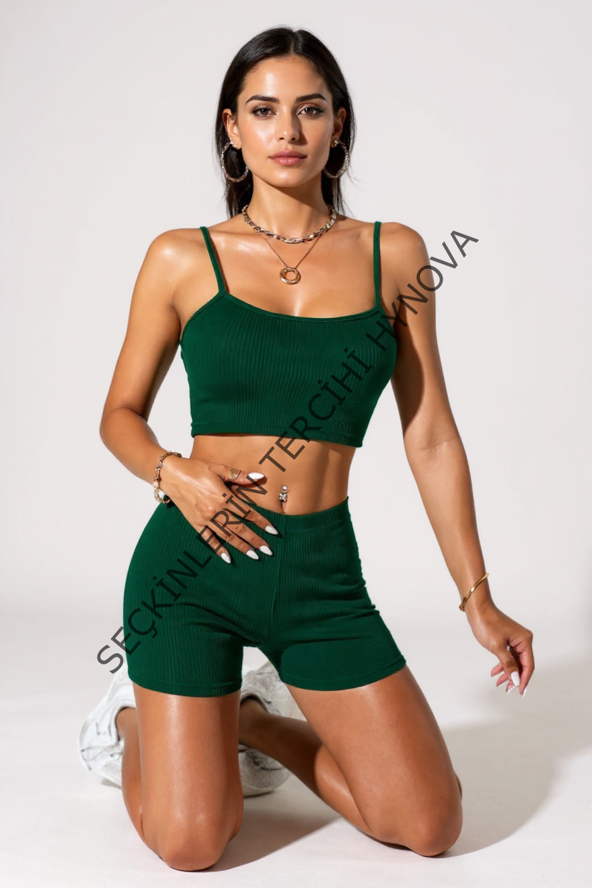 Kadın Yeşil Şortlu Kaşkorse Gecelik Takım – Modern, Konforlu ve Günlük Kombinlere Uygun