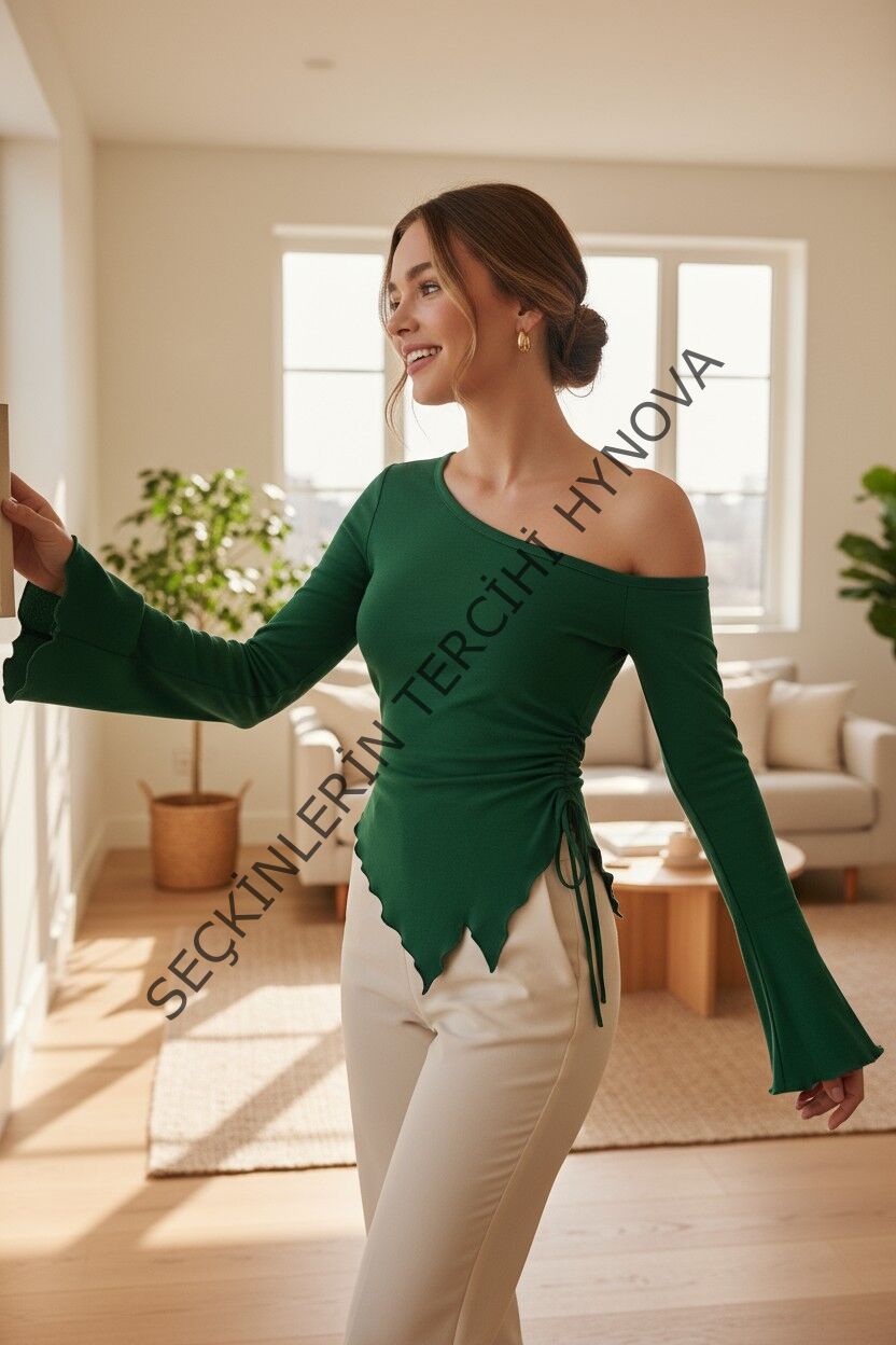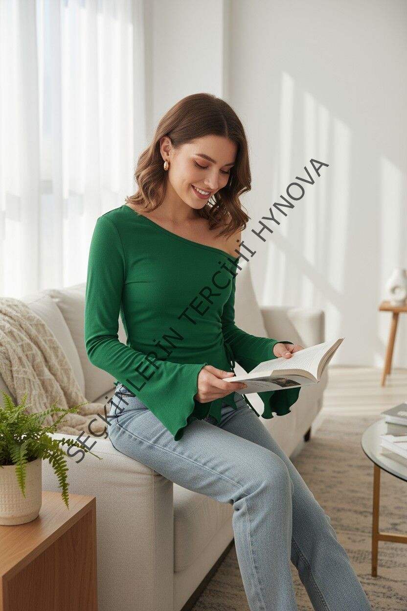 - Kadın Yeşil Asimetrik Yaka Drapeli Yan Bağlamalı Bluz, doğanın huzurunu ve modern zarafeti buluşturuyor.
