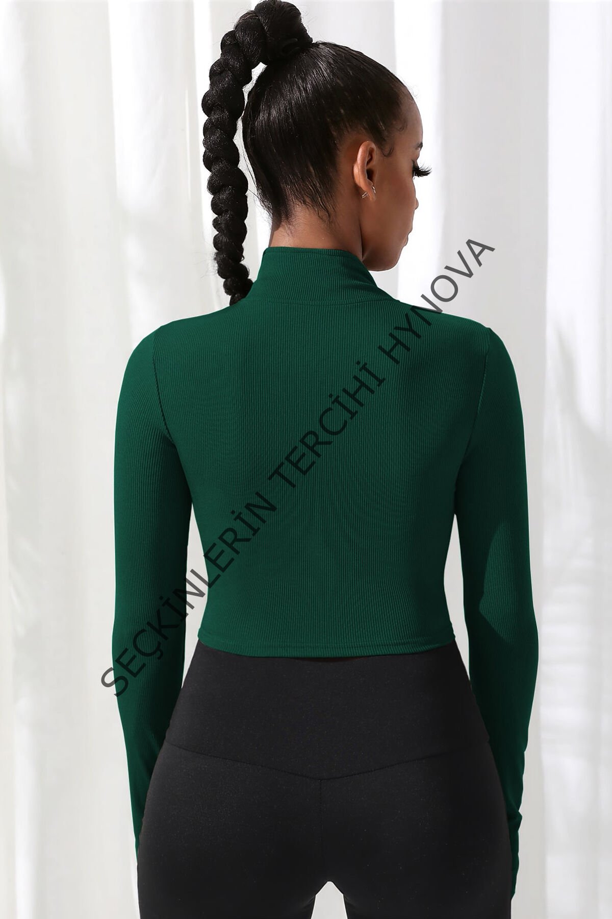 Kadın Yeşil Uzun Kol Fermuarlı Parmak Geçme Detaylı Dik Yaka Crop Top Bluz