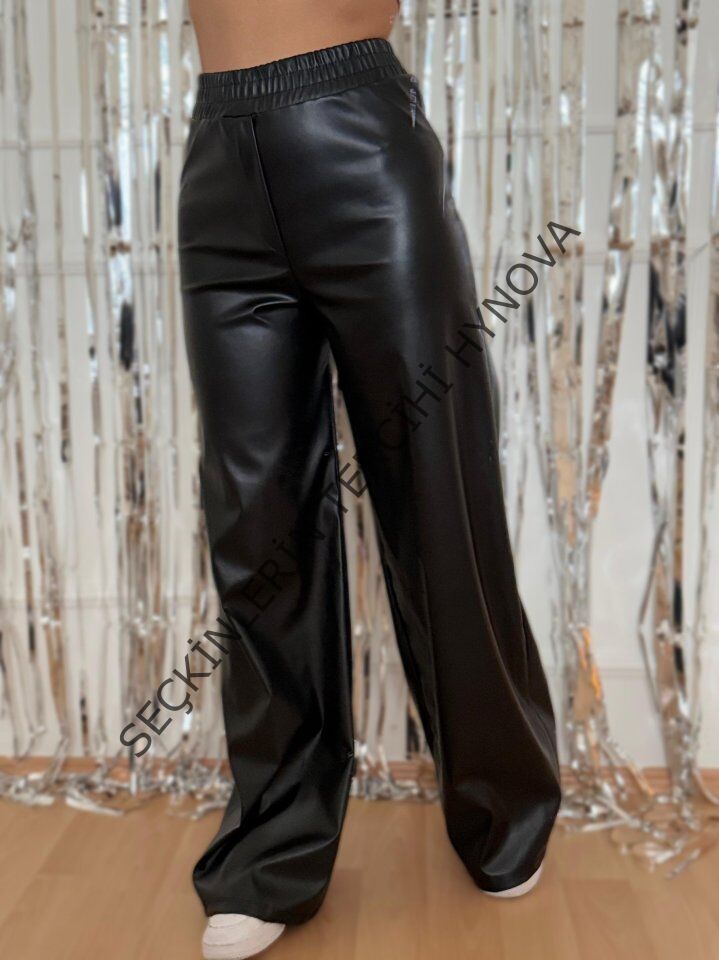 Kadın Yılbaşı özel Yüksek Bel Beli Lastikli Geniş Paçalı Deri Pantolon