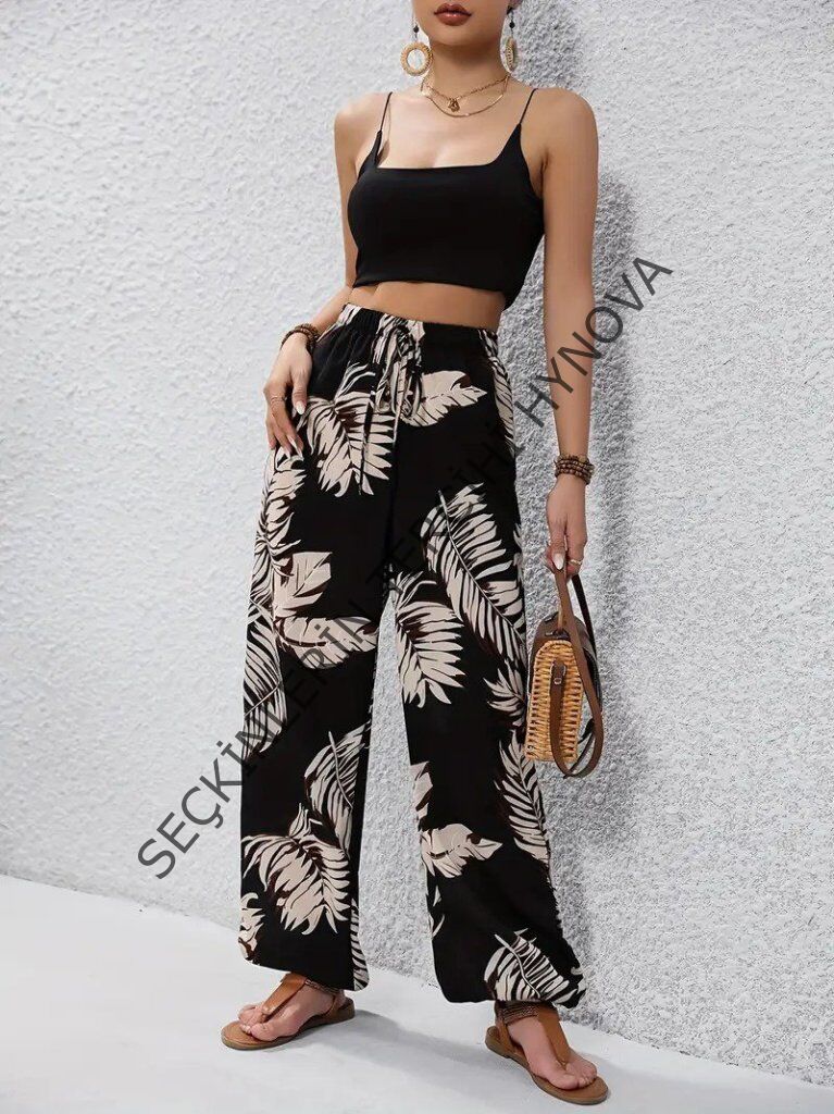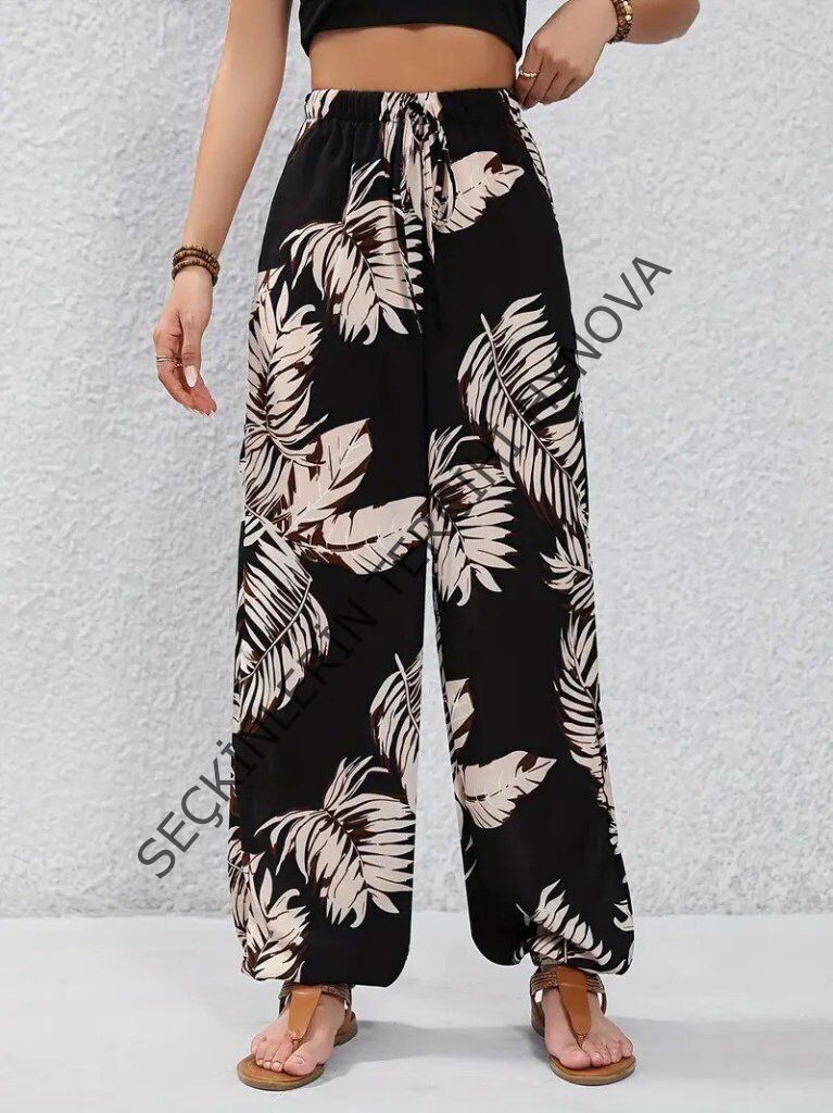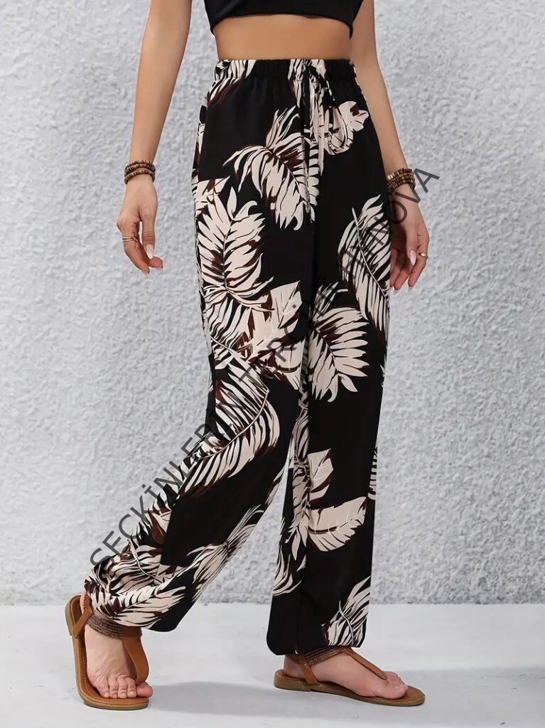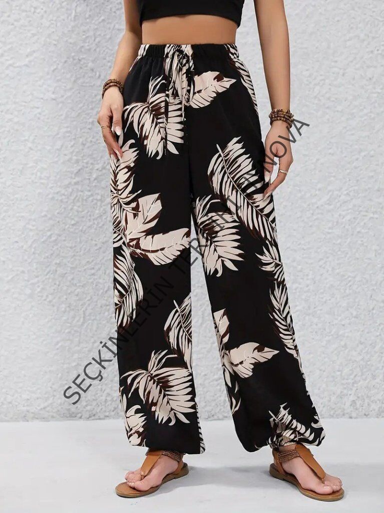 Kadın Yüksek Bel Bağcıklı Yaprak Desenli Süprem Pantolon