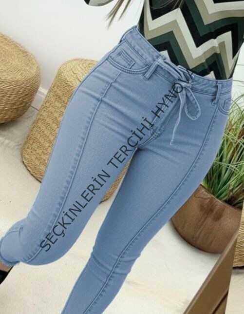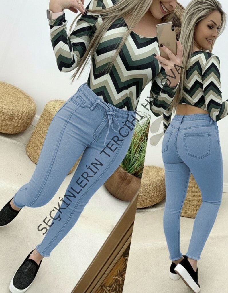 Kadın Yüksek Bel Belden Kuşaklı Yırtık Detaylı Kot Pantolon