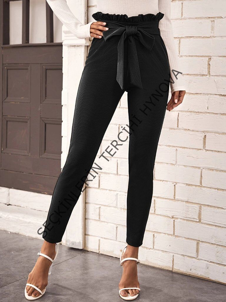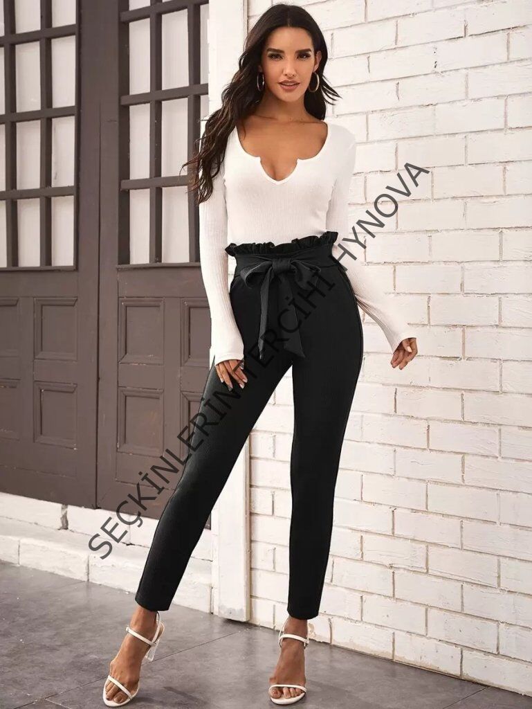 Kadın Yüksek Bel Beli Fırfırlı önden Bağlamalı Ithal Krep Pantolon