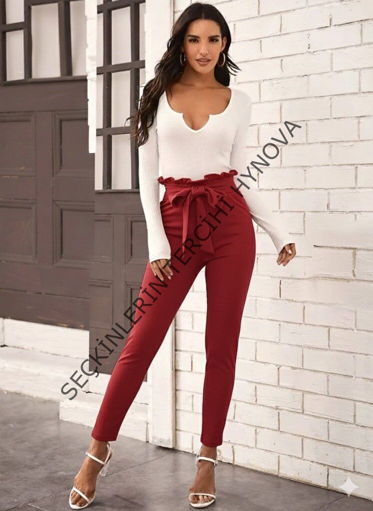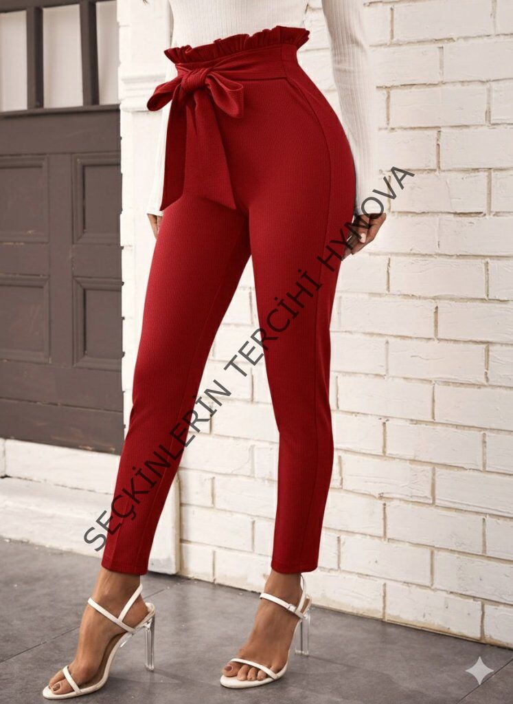 Kadın Yüksek Bel Beli Fırfırlı önden Bağlamalı Ithal Krep Pantolon