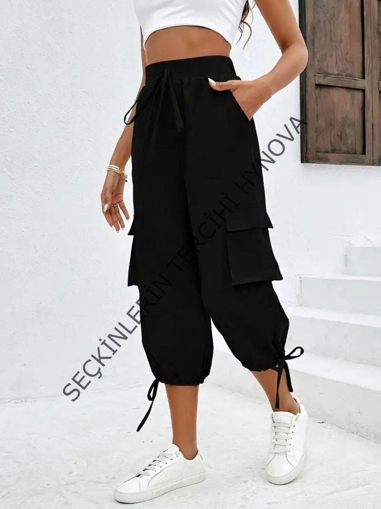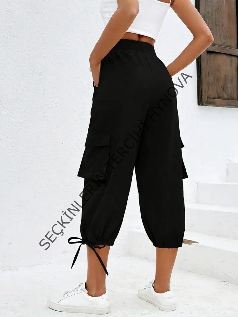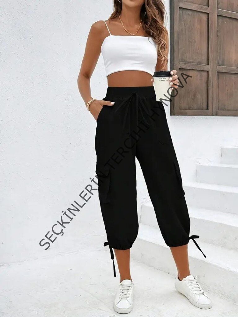 Kadın Yüksek Bel Beli Lastikli Bağcıklı Cepli Kargo Viskon Iki Iplik Pantolon