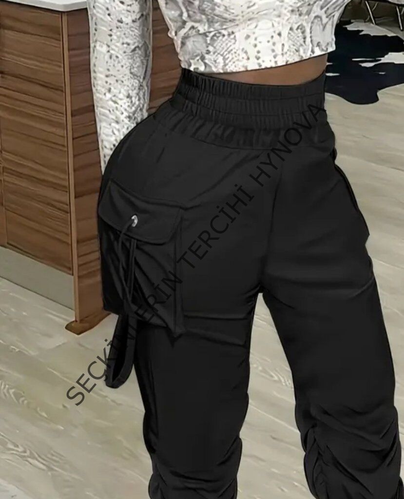 Kadın Yüksek Bel Beli Lastikli Kargo Cep Detaylı Gabardin Pantolon