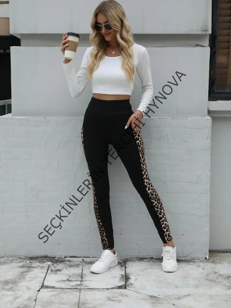 Kadın Yüksek Bel Cep Detaylı Leopar Desenli Dalgıç Tayt