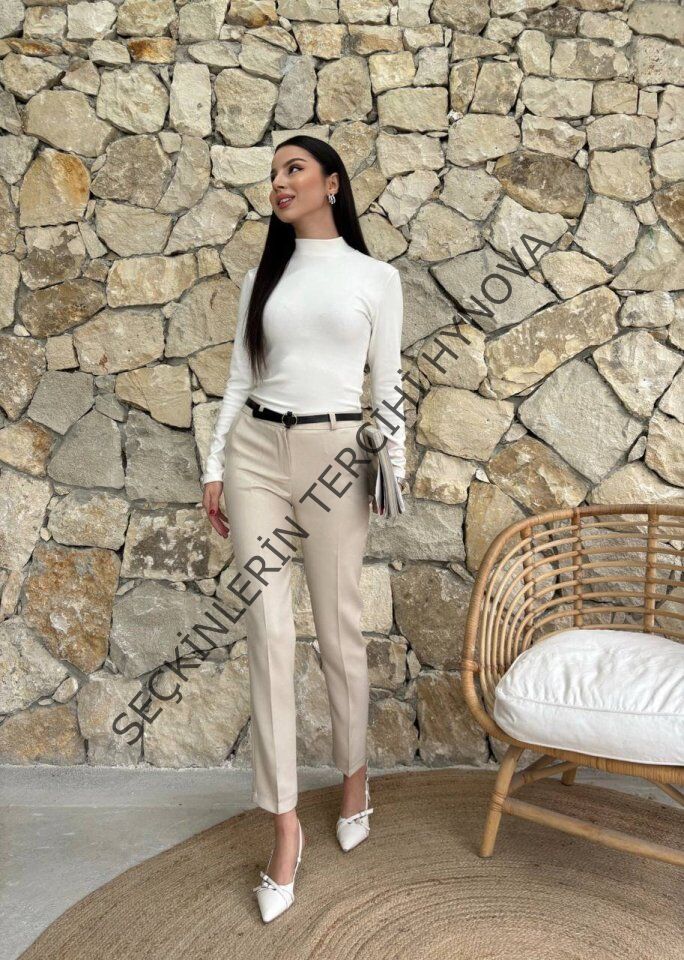 Kadın Yüksek Bel Dar Paça Kemer Dahil Kumaş Pantolon