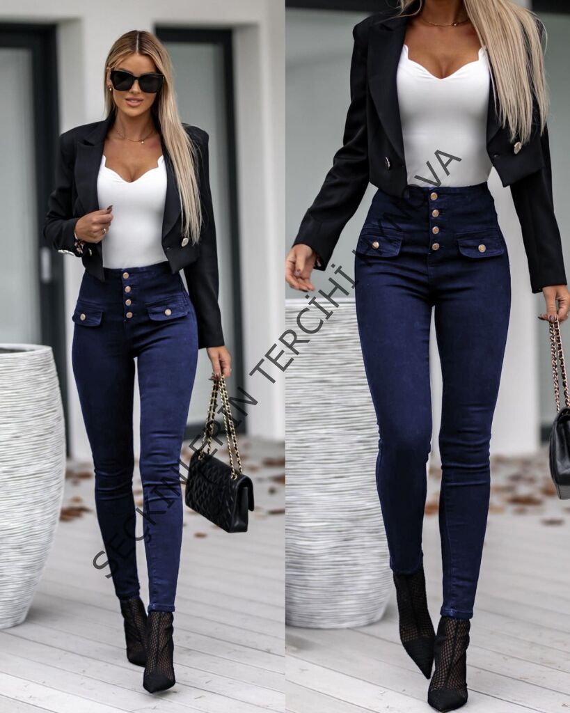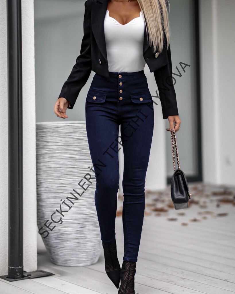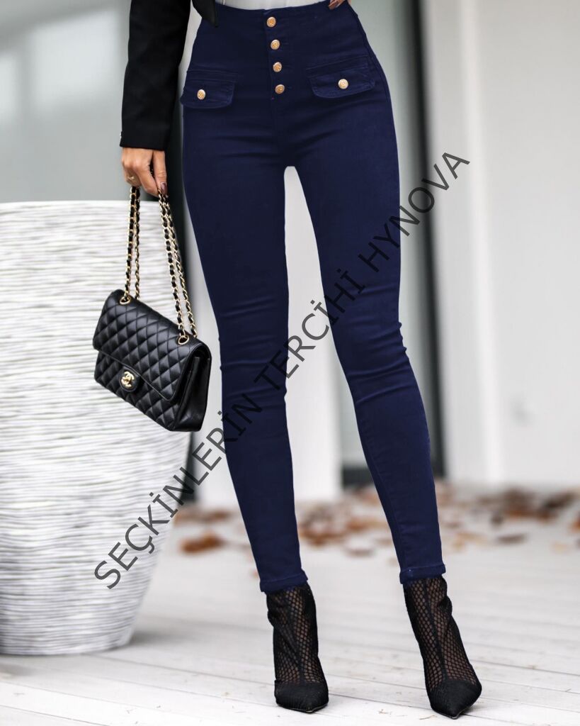 Kadın Yüksek Bel Düğmeli Cep Detay Kot Pantolon