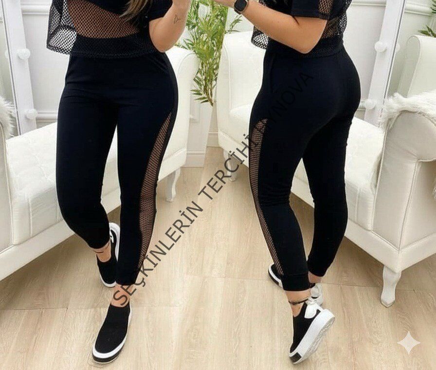 Kadın Yüksek Bel File Detaylı Dar Kesim Viskon Iki Iplik Pantolon
