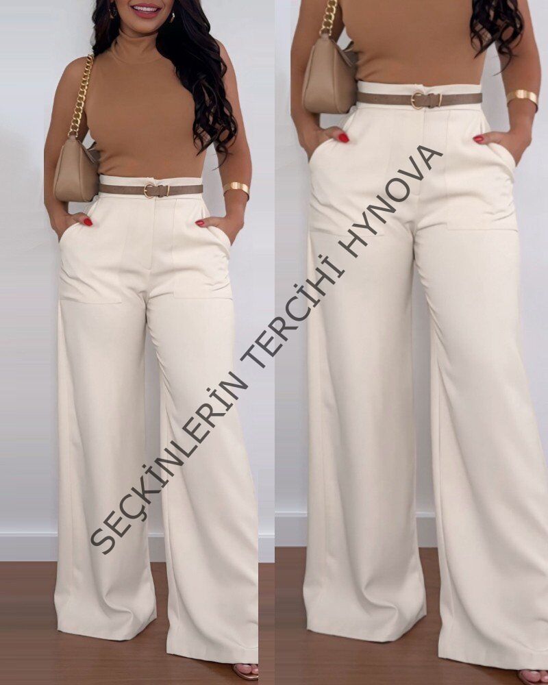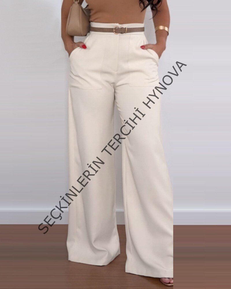 Kadın Yüksek Bel Geniş Paça Detaylı Cepli Ithal Krep Pantolon