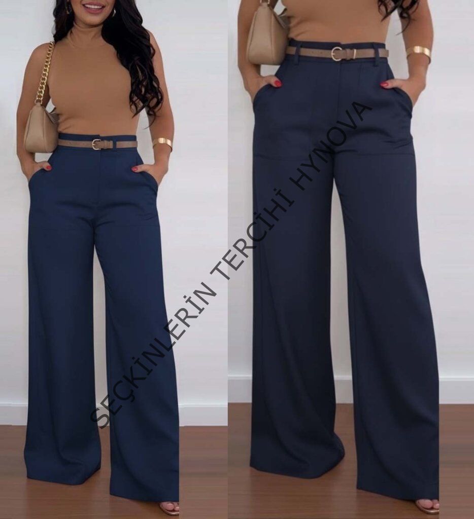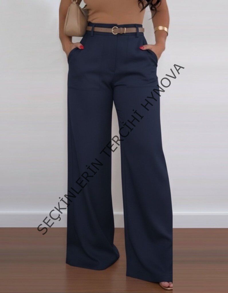 Kadın Yüksek Bel Geniş Paça Detaylı Cepli Ithal Krep Pantolon